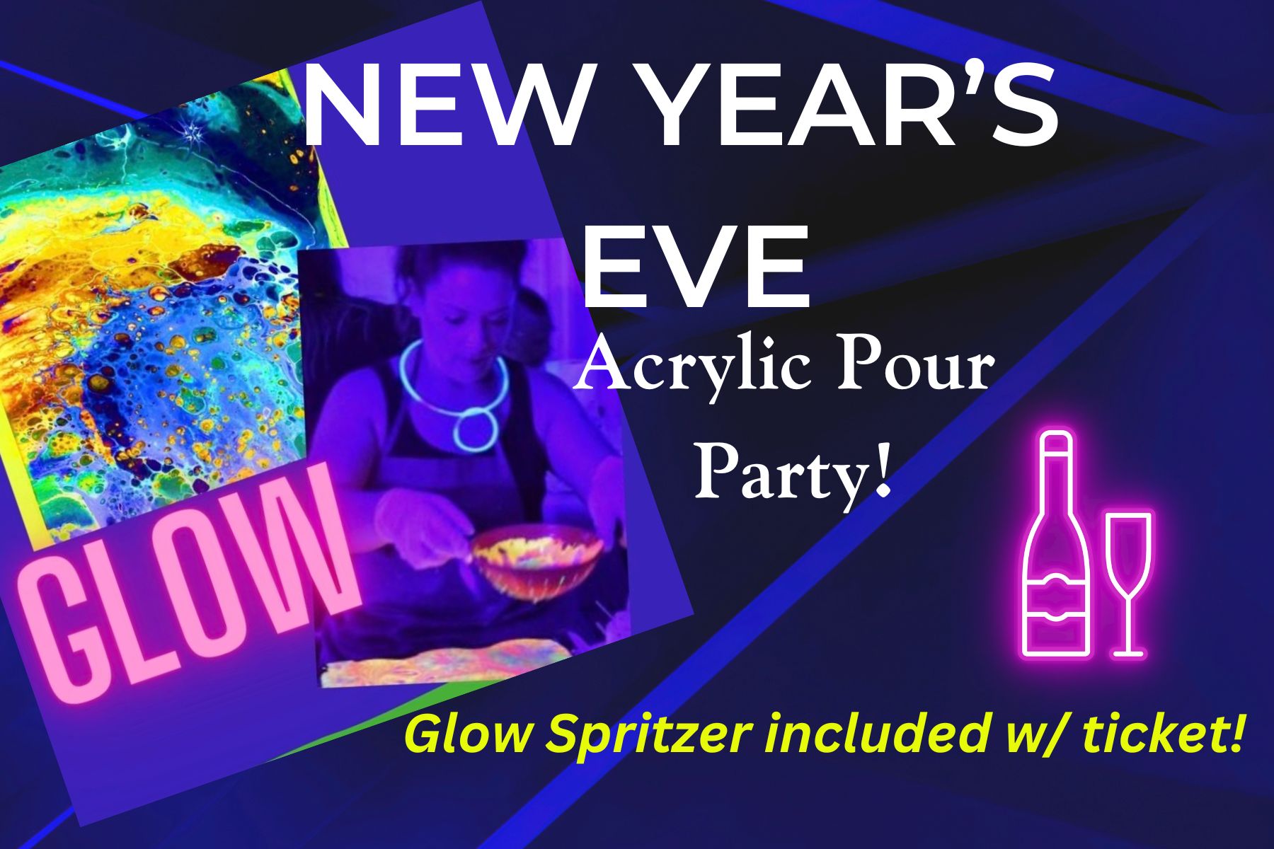 Acrylic Pours are exciting and perfect for beginners! Join us for this thrilling BLACKLIGHT Party with fluorescent colors, jamming music, and delicious wines to celebrate NEW YEAR’S EVE! Each guest will be led by our incredible instructors to do two pours on 11″x14″ canvases. A portion of class will be taught under blacklight for added drama!