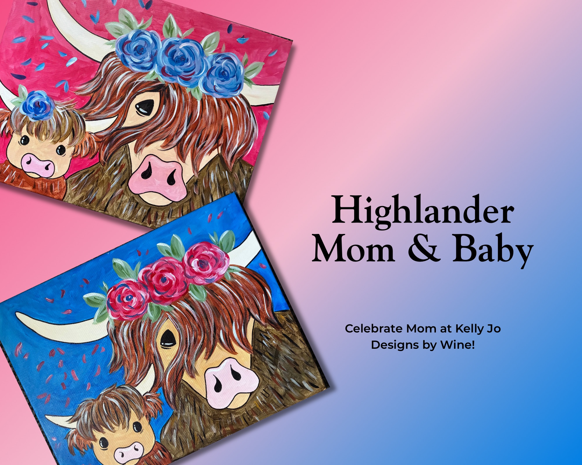 Celebrate Mother’s Day and paint these darling mama/baby highlander combos! Enjoy wines from Los Ranchos Winery!